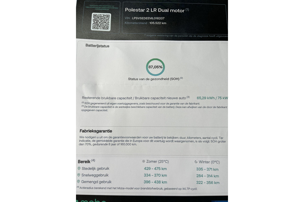 SOH (state of health) 87%, is uitgelezen en er zit een certificaat bij.